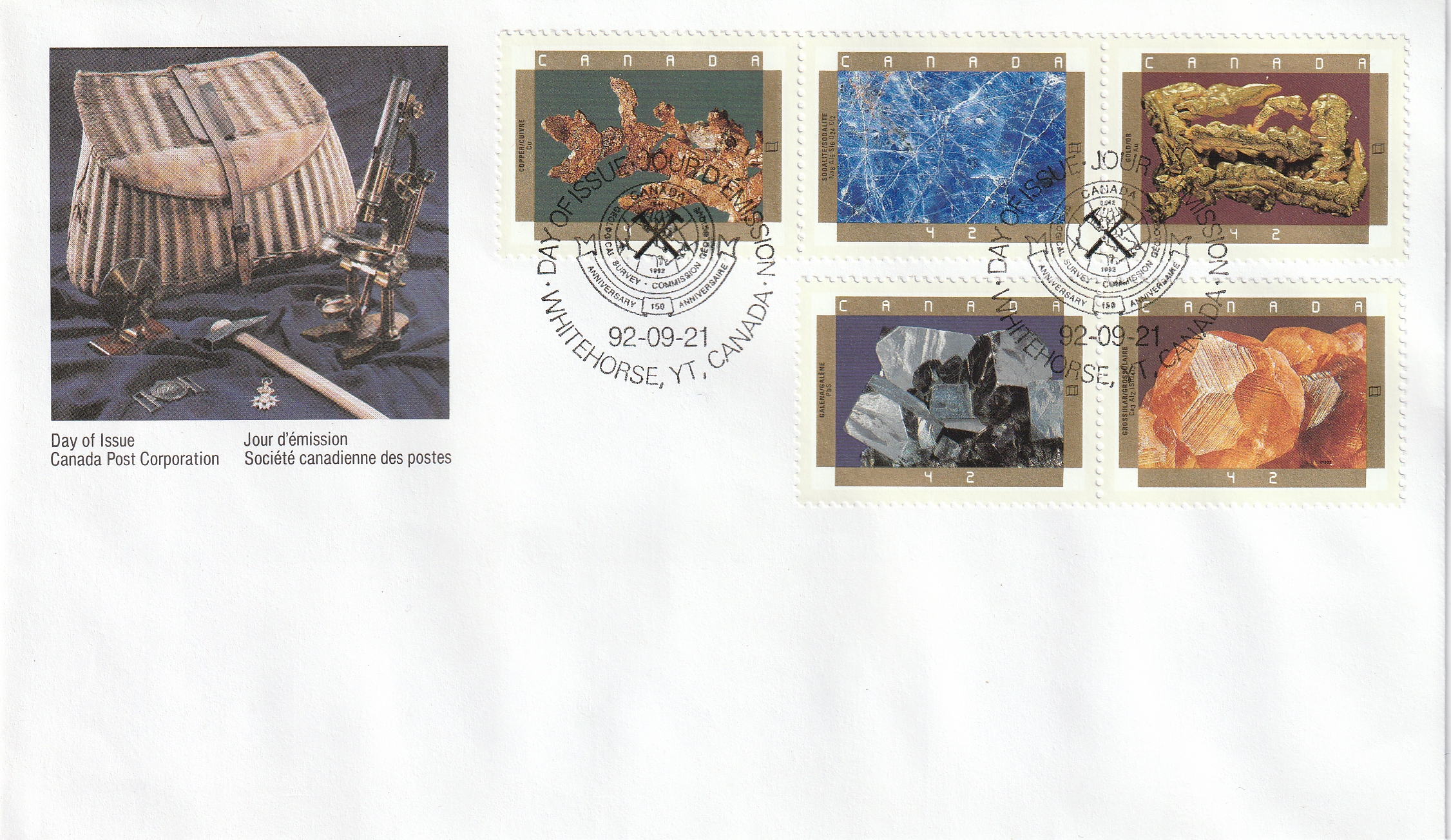 1992 Canada FDC Scott catalogue number 1440a Canadian Minerals. Horizontal strip of 5 containing 1436 – 1440. 1436 Copper, 1437 Sodalite, 1438 Gold, 1439 Galena & 1440 Grossular.