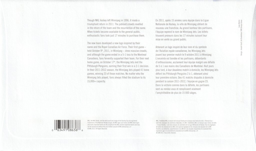 2013 Canada FDC Scott catalogue number 2675 Canadian NHL Team Jerseys: Winnipeg Jets.